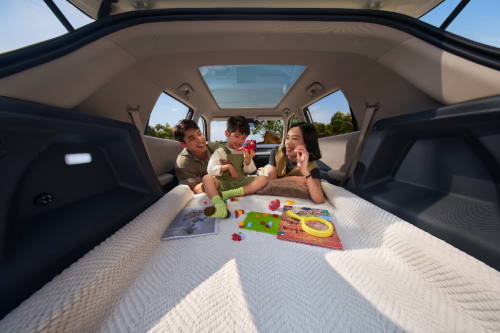 “大空间” 则是家庭 SUV 的核心竞争力,纳米 06 在空间设计上充分考虑了家庭用户的多样化需求。其轴距达到 2715mm,这一尺寸直接转化为宽敞的后排腿部空间 —— 即使身高 180cm 的成年乘客坐在后排,膝盖与前排座椅之间仍有充足活动空间,长途乘车也不会感到拥挤;若孩子坐在儿童安全座椅上,旁边的老人也能轻松舒展身体。更值得称赞的是空间利用率,纳米 06 的得房率高达 85%,意味着在相近车身尺寸下,它能将更多空间分配给乘坐与储物区域,避免 “车身显大、内部局促” 的问题。后备厢常规容积为 500L,轻松装下 2 个 28 寸行李箱、1 个儿童推车与若干随身物品;当需要装载露营装备、婴儿床等大件物品时,将后排座椅放倒后还能秒变 “大平层”,空间灵活性拉满。此外,纳米 06 还采用同级独有的 “天地门” 设计,天门可遮阳挡雨,地门承重达 150KG,后排座椅放倒后能衔接天地门形成 2 米 “观星榻”,全家露营时可化身露天影院,让家庭出行更具乐趣。